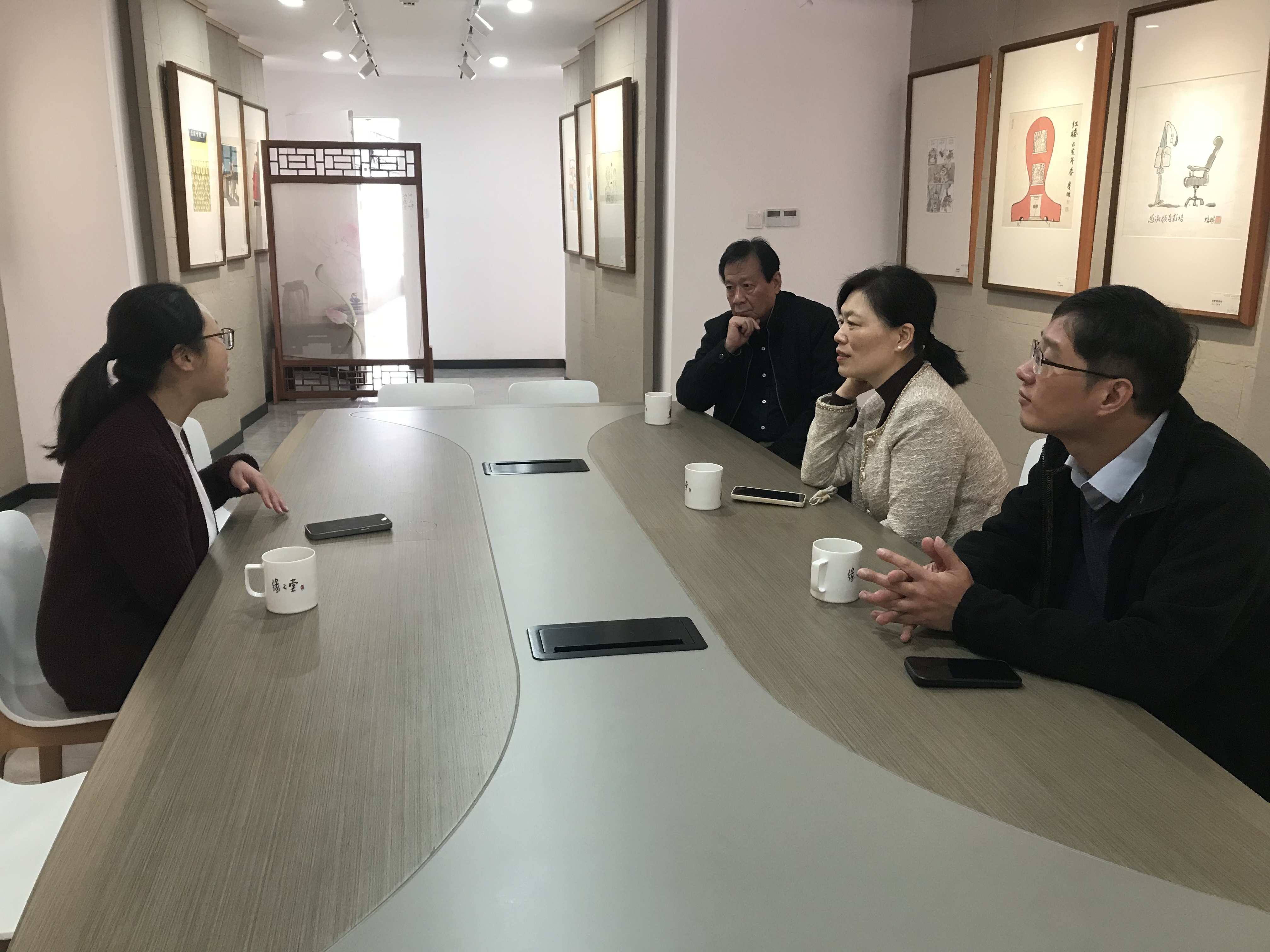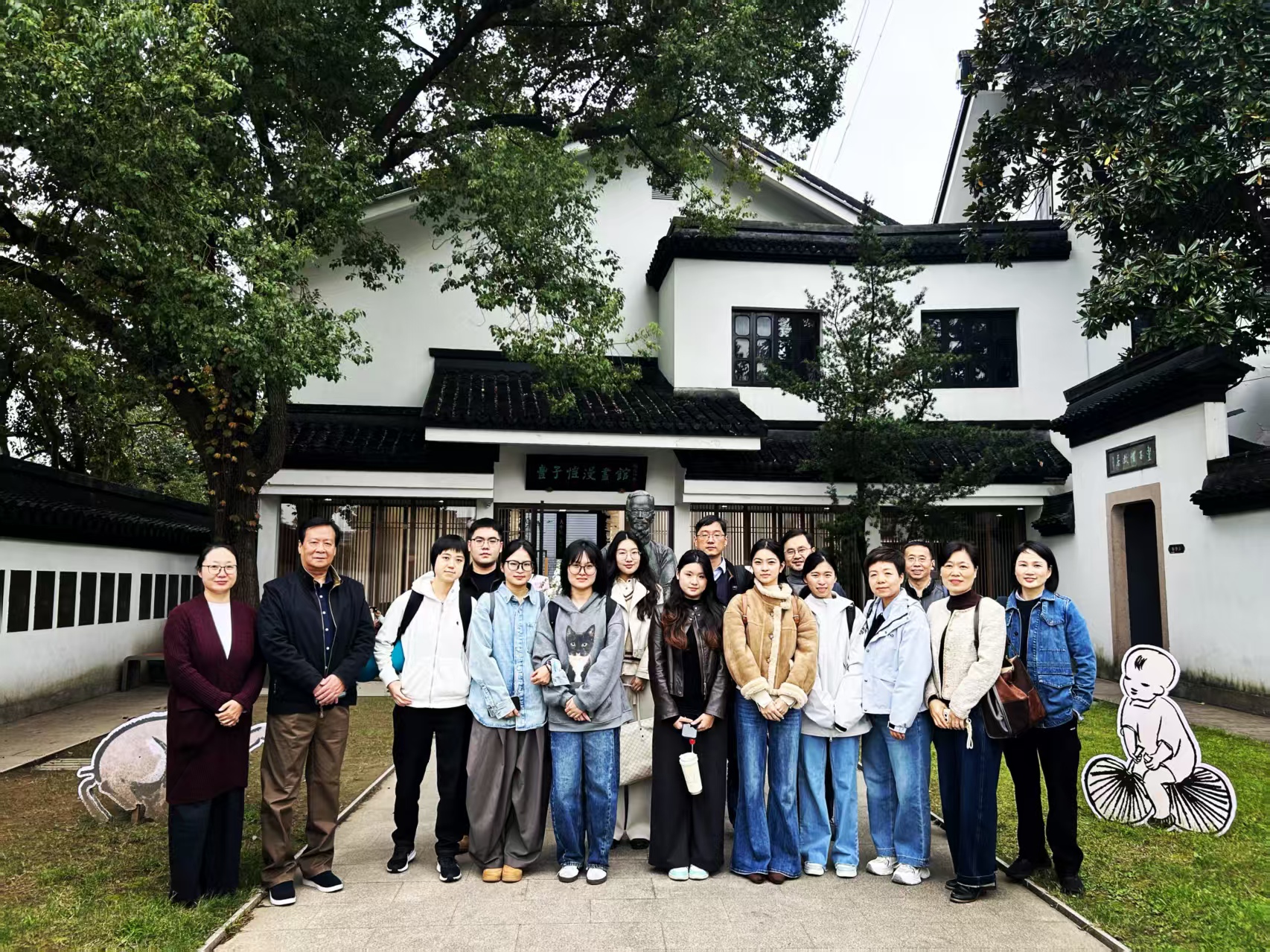 在桐乡丰子恺纪念馆,学院师生在纪念馆负责人陪同下,参观了缘缘堂旧址、丰子恺漫画馆及廉政漫画馆,重点观摩了“漫画里的家国情怀”“抗日救国漫画系列”等主题展陈。一幅幅笔简意丰、情致真淳的作品,生动呈现了丰子恺先生在民族存亡之际的艺术担当与精神坚守,其“护生护心”的美学理念与“诗意栖居”的人生实践,深深感染了在场师生。学院负责人在交流中表示,丰子恺先生的艺术创作不仅具有高度的审美价值,更承载着深厚的家国情怀与清廉自守的人格理想,其融美育、德育与人文教育于一体的精神遗产,与学院育人目标高度契合。座谈交流环节,双方围绕美育实践基地建设、美育资源共享、文创活动联办等内容展开深入交流与探讨。