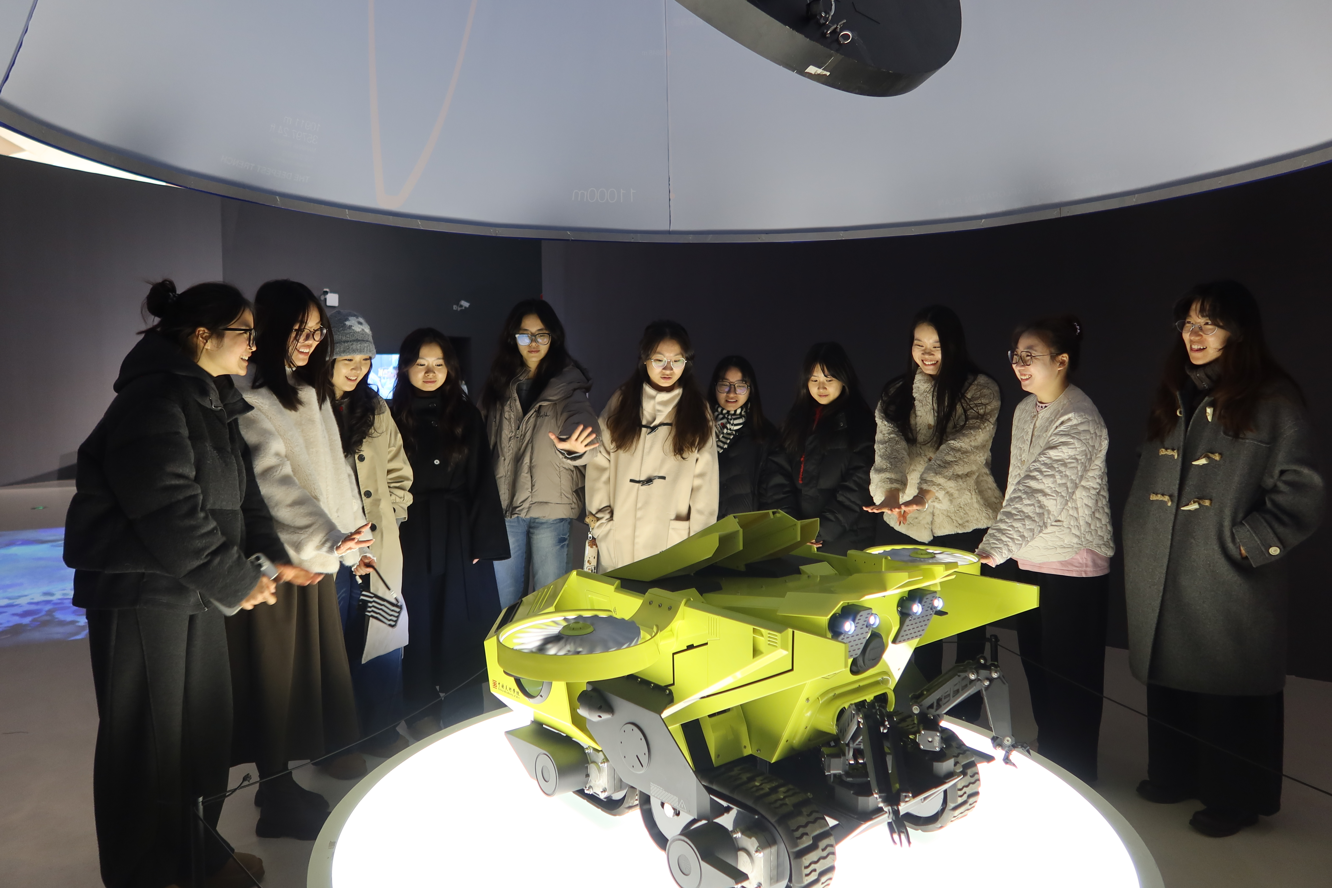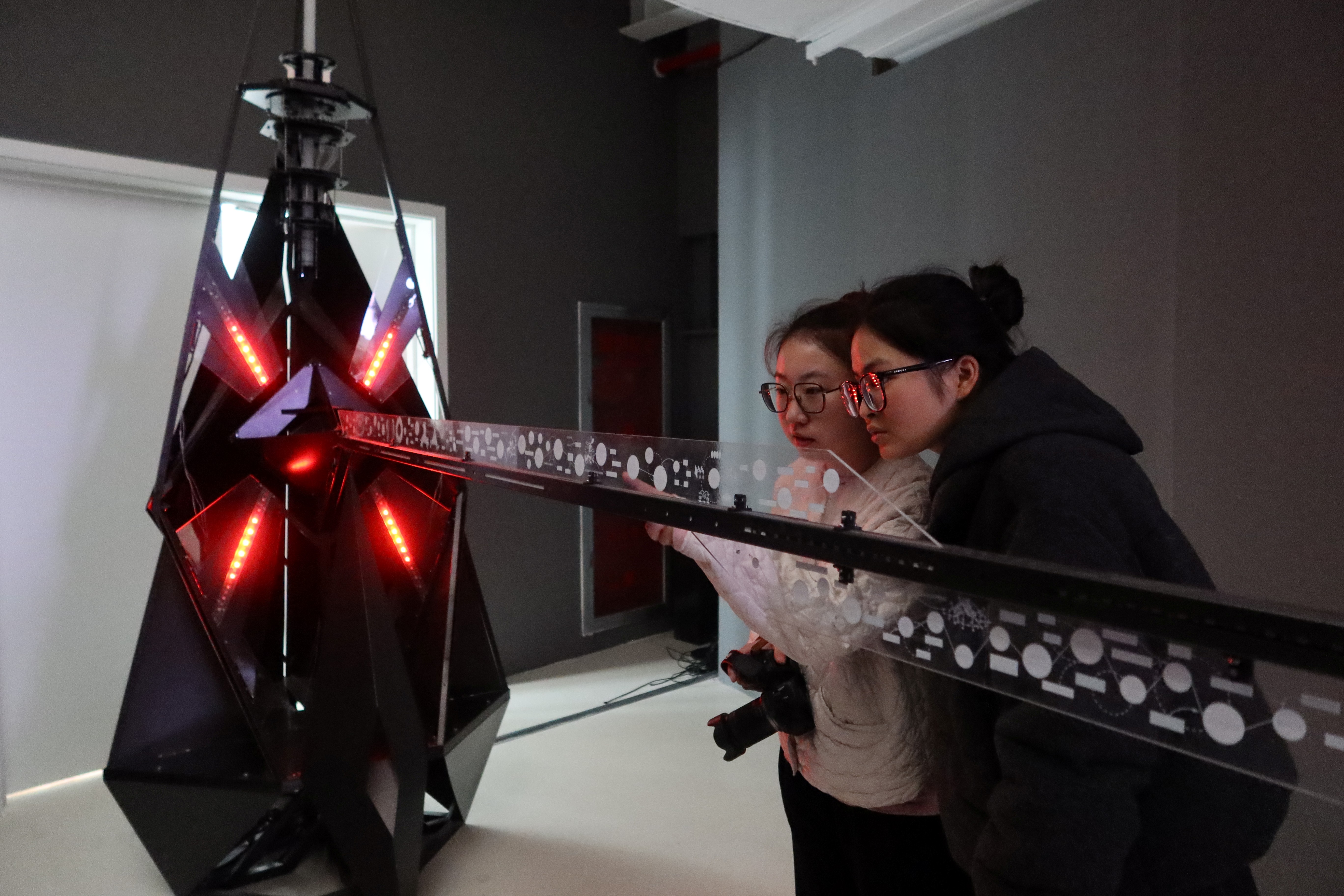在展览现场,不同文化背景下的艺术表达相互交织,传统美学精神与现代科技手段完美融合。来自欧洲的艺术家以算法为笔,将自然生态的演变过程转化为流动的数字光影;亚洲艺术家则运用虚拟现实技术,让观众“穿越”时空,与传统非遗技艺进行沉浸式对话;国内新锐创作者通过大数据分析,将艺术与科技发展的轨迹转化为可触摸的雕塑作品。学生们驻足于每一件作品前或仔细聆听作品背后的创作理念,或围绕作品的艺术表达与技术运用展开热烈讨论。从静态的视觉欣赏到动态的参与互动,从单一的艺术感知到多元的思维碰撞,学生们在观展过程中深刻体会到,科技不仅改变了艺术的创作方式,更重塑了艺术的审美维度与传播路径。