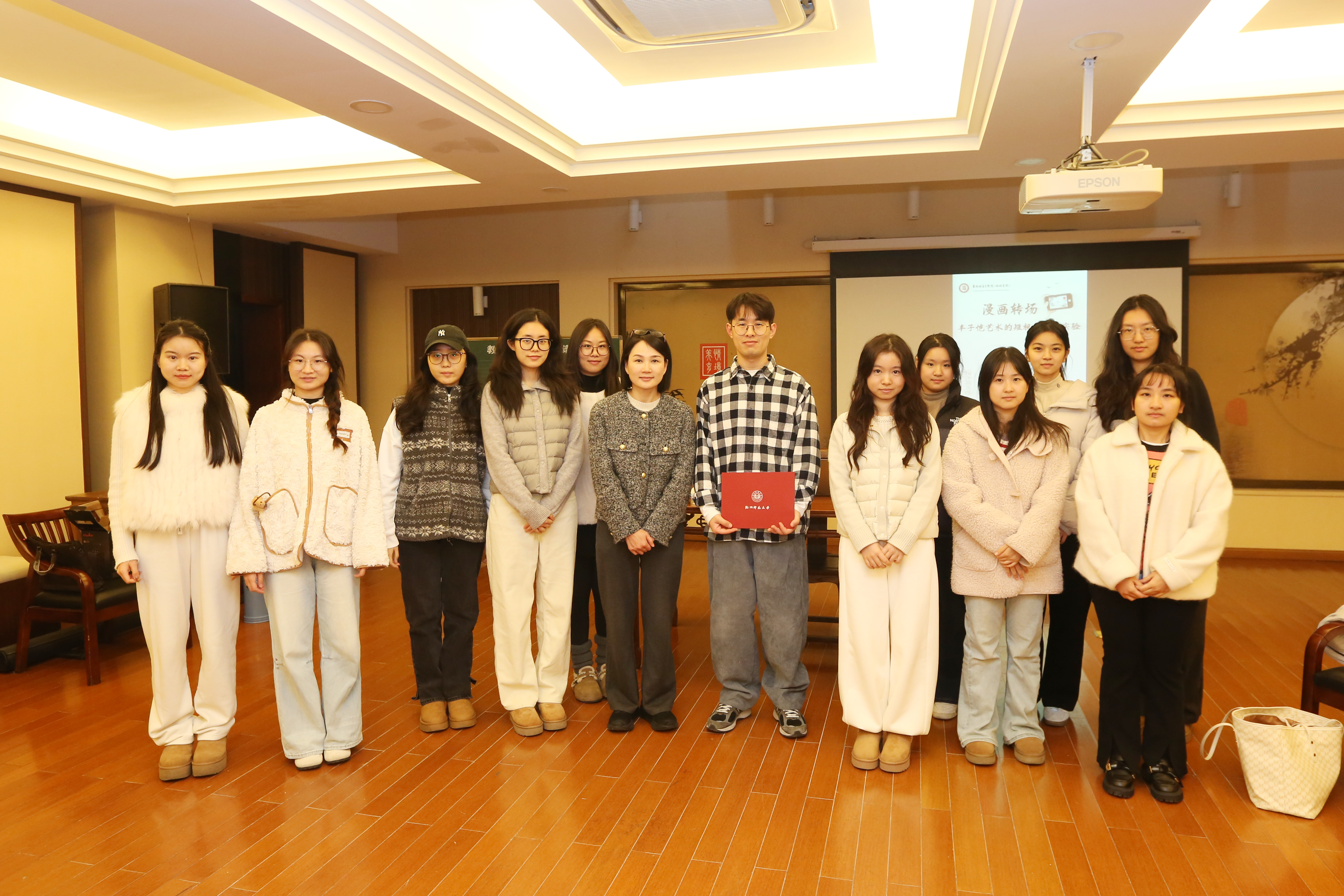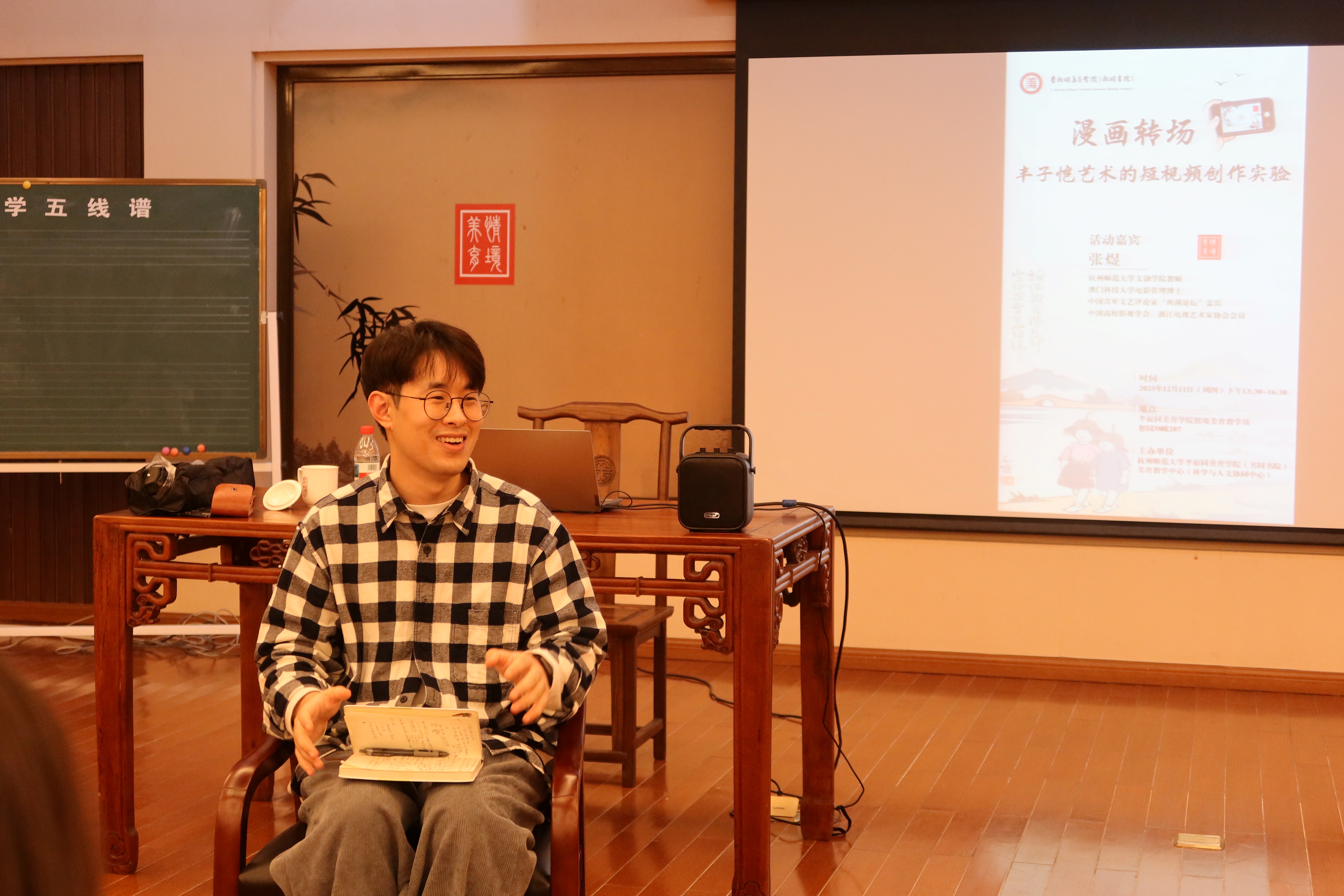 2025年12月11日,“漫画转场:丰子恺艺术的短视频创作实验”情境美育工作坊在杭州师范大学李叔同美育学院(叔同书院)恕园38幢207顺利举行。本次活动特邀杭州师范大学文化创意学院张煜老师担任指导,以沉浸式实践的形式,带领同学们探索传统漫画美学与短视频创作的融合路径。
