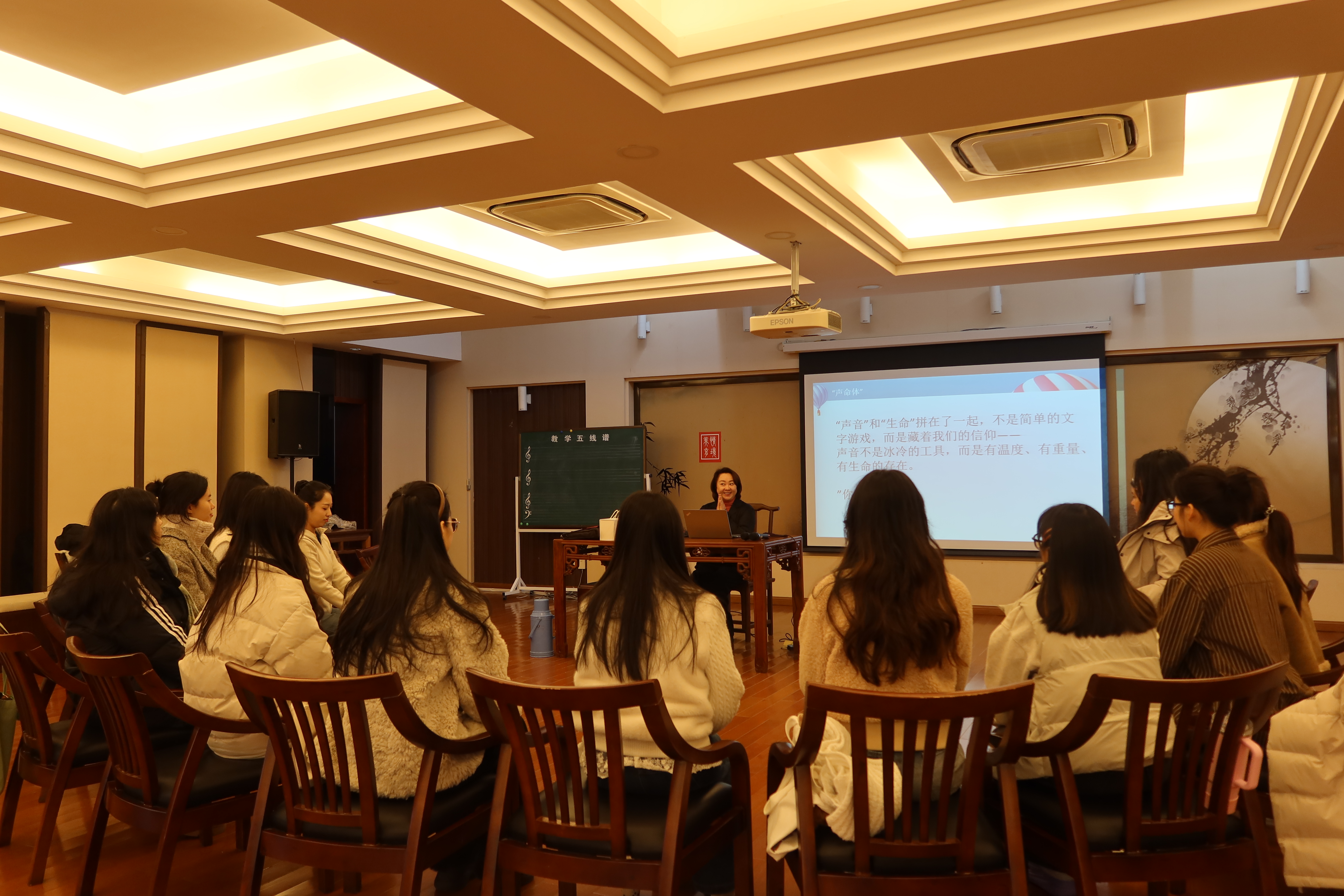 针对“外四”技巧,孙越老师采用“理论+实操”模式教学。她先系统阐释停连、重音、语气、节奏的核心要点,随后以《江雪》为例现场示范,通过不同停连方式对比,分别凸显孤寂心境与空濛辽阔之景;在《望庐山瀑布》指导中,强调“直下”需重读加速以显磅礴气势,“落”字需放缓语气以营造梦幻感。参与者们跟随示范反复诵读,迅速领悟技巧对诗词意境的升华作用。