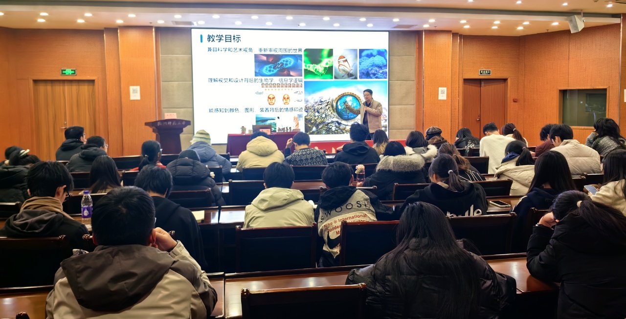 李旭研究员以轻松幽默的语言,讲述了自己从“美育小白”到跨界探索者的转变历程。他表示,在多年科普与教学实践中,他逐渐意识到科学与艺术并非对立,而是可以相互激发、彼此成全的创意伙伴。在与南京艺术学院合作开设的“生物之美”课程中,来自数学、物理、电子、生物等不同专业的同学们,通过学习视觉机制、色彩感知与生物结构,结合艺术设计与AIGC技术,将抽象的科学概念转化为充满想象力的视觉作品。
