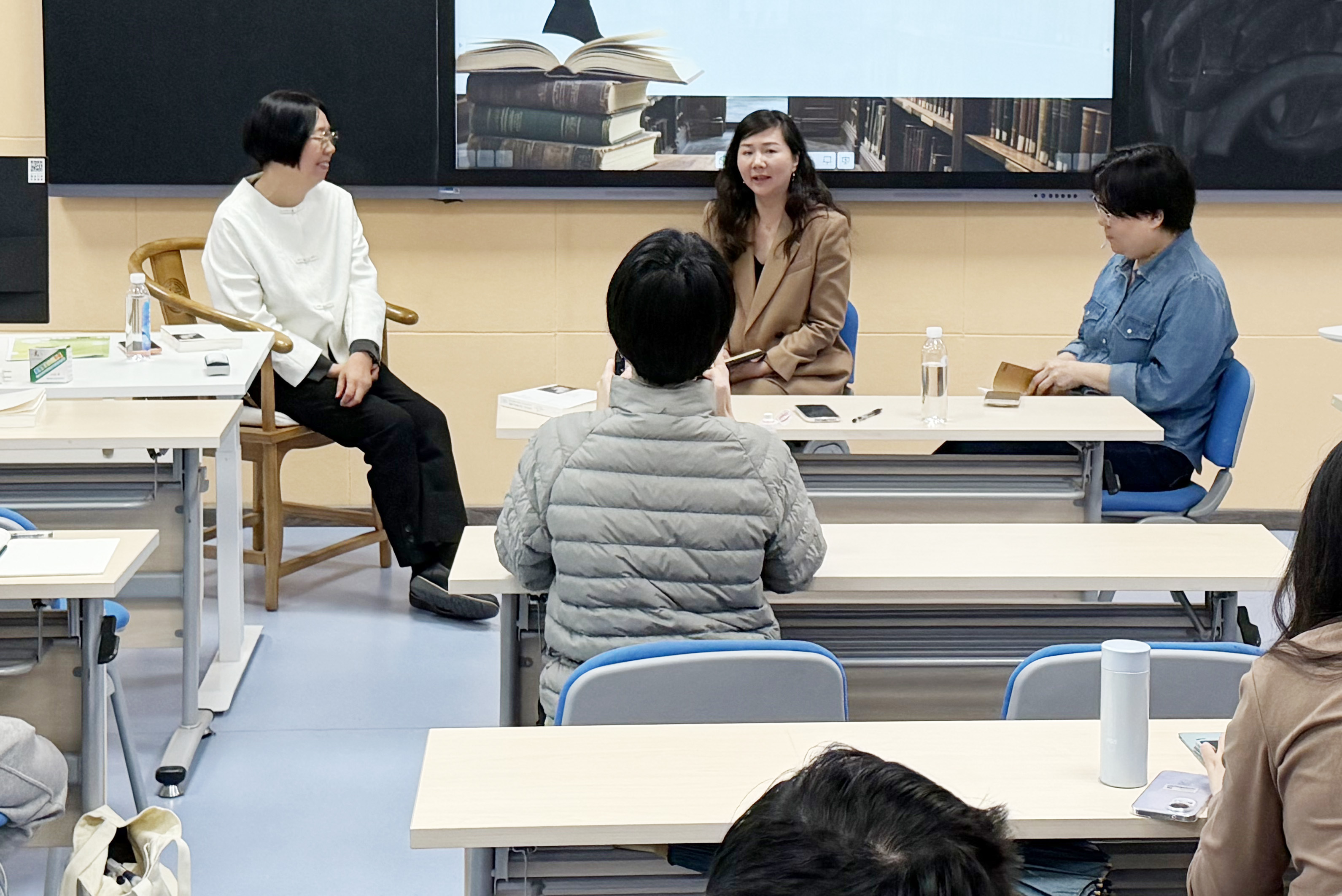 在对谈环节中,三位老师围绕文本阐释的多元可能性、历史语境对文学创作的影响、女性主义与新历史主义批评的贡献与不足等议题展开深入探讨与精彩对谈,并结合当代文艺作品和现实语境讨论了女性主体性建构的意义与价值,进一步拓展了讲座的理论深度与思考边界。在接下来的听众提问与交流环节,张岩冰老师回答了现场同学提出的如何运用女性主义理论视角理解女性处境和文化叙事等问题,引发在场师生的共同思考与讨论。